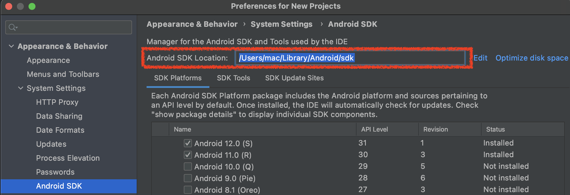 android_sdk/platform-tools로 이동합니다. 저 sdk 경로는 전체검색 (mac 기준 shift 두 번) 에서 sdk를 입력하면